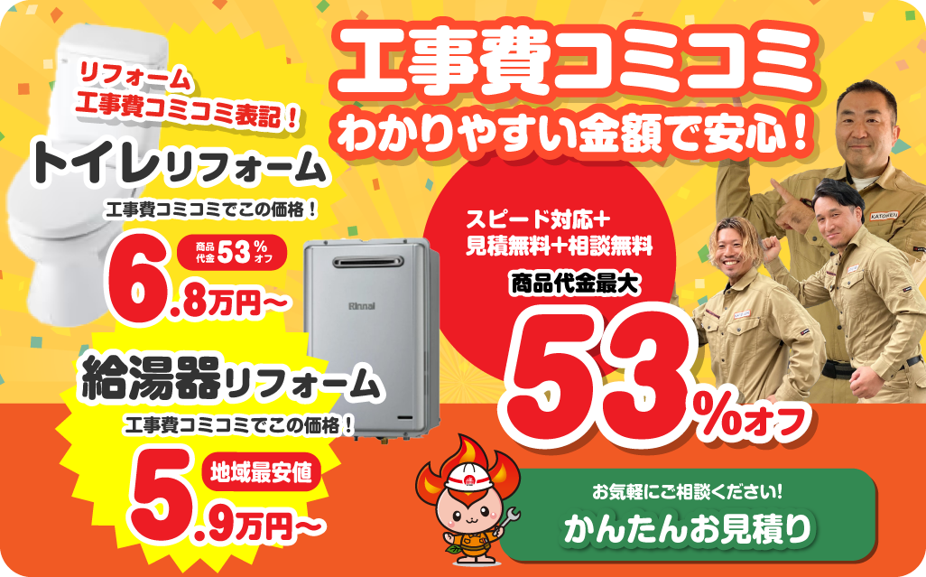 カトネン1Dayリフォームは商品代金+工事費+その他処分費用等、諸々の諸経費をすべてコミコミ価格でご案内しています。