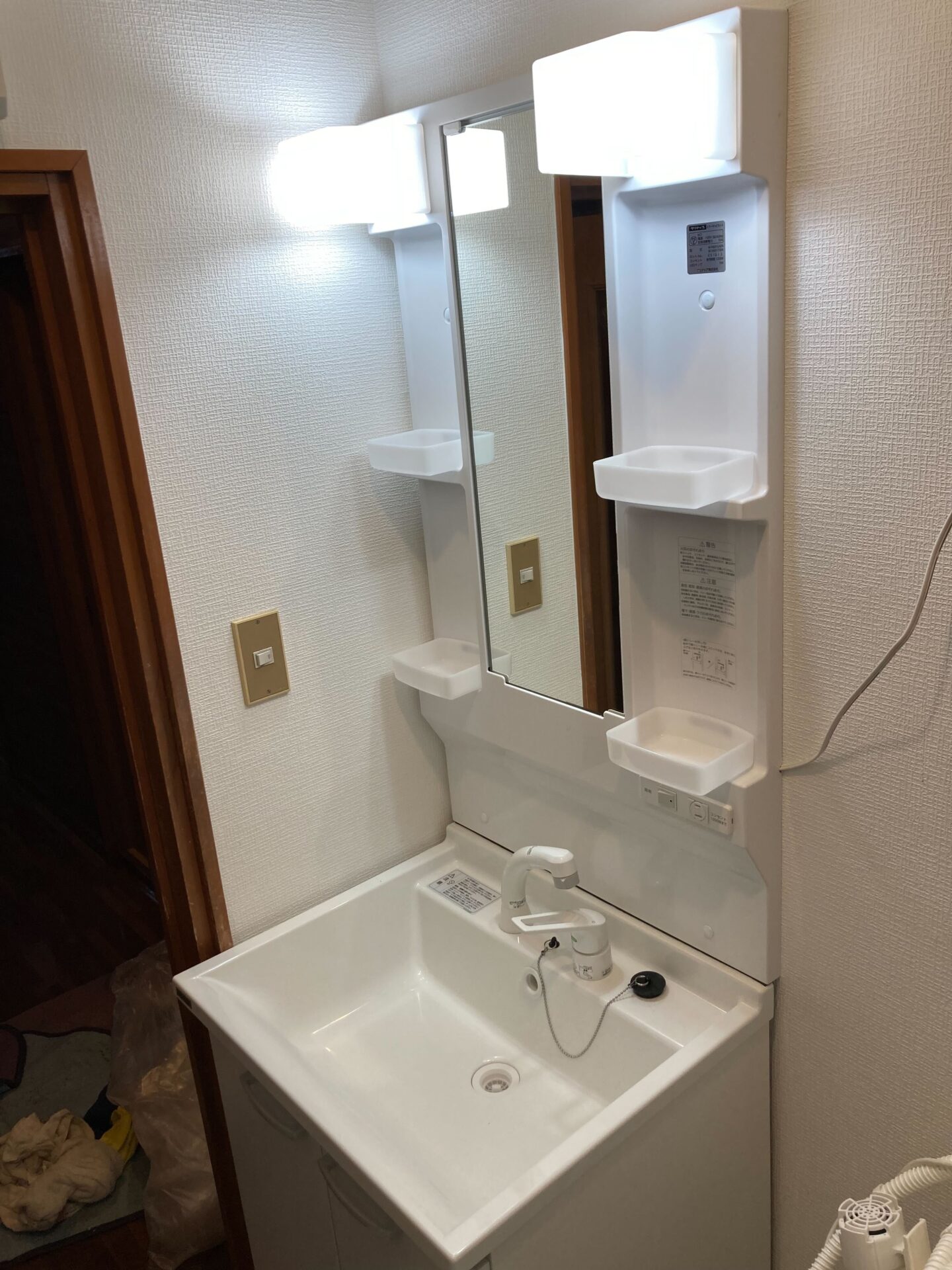 午前中の朝のうちに洗面化粧台を外してクロスの張替、午後に新しい洗面化粧台を設置。その日のうちに作業が完了いたしました。