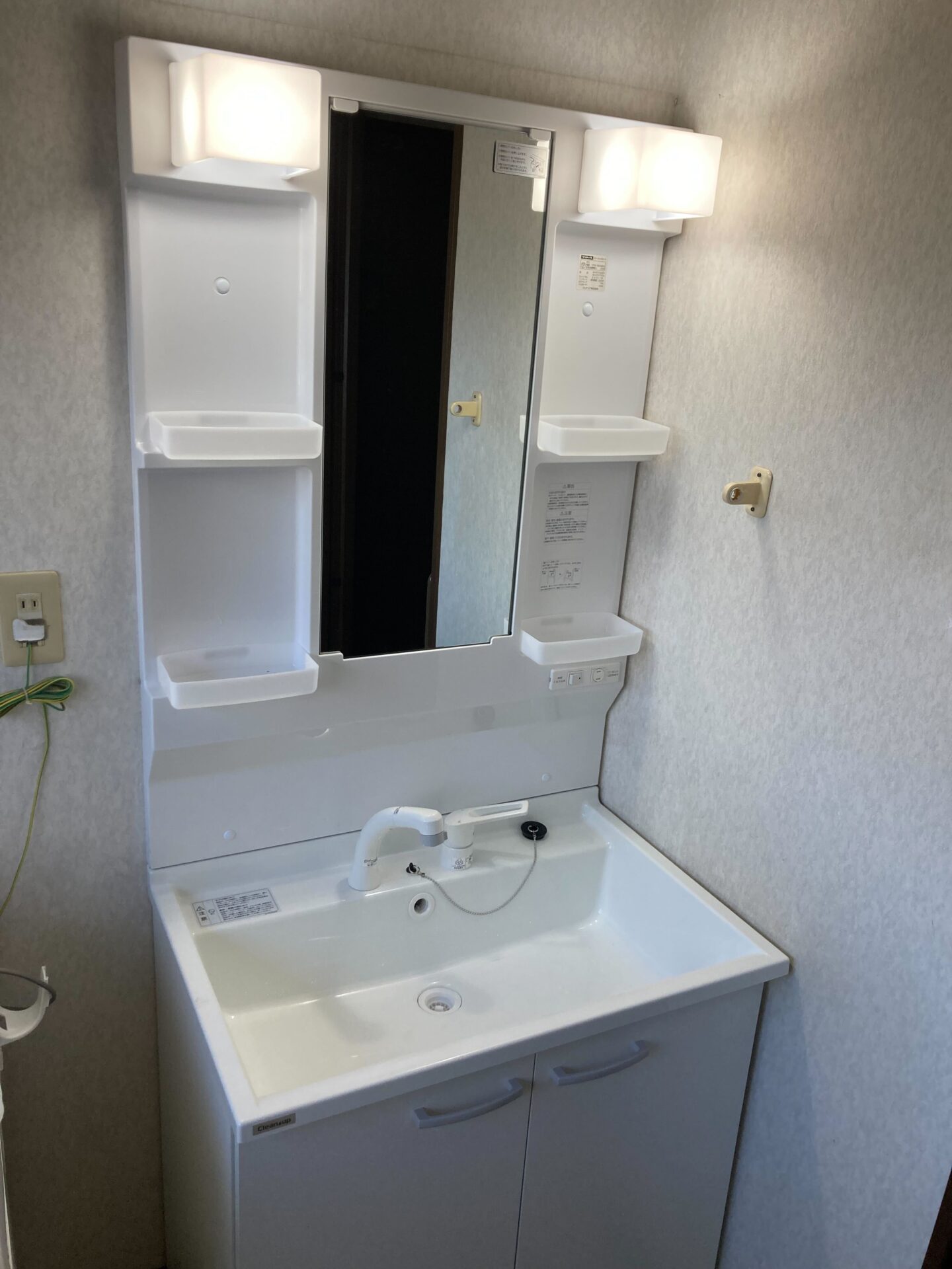 お客様のご希望で今回はシャワー付のレバー水栓がついた洗面化粧台をお選びいただきました。
